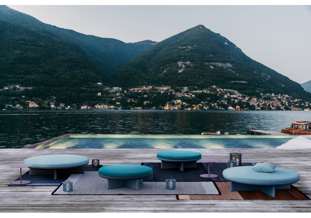 Cala diseñado por Doshi Levien para Kettal es un puf con base de aluminio pintado o teca. Los cojines están acolchados y revestidos de tejido apto para exterior. Cala está disponible en diferentes acabados y tamaños.