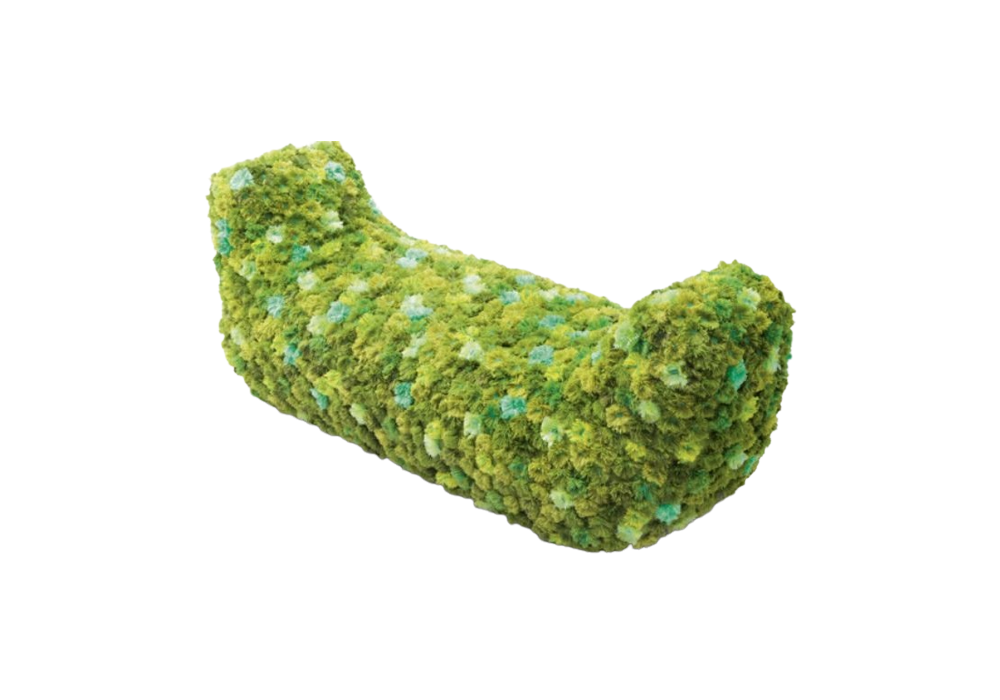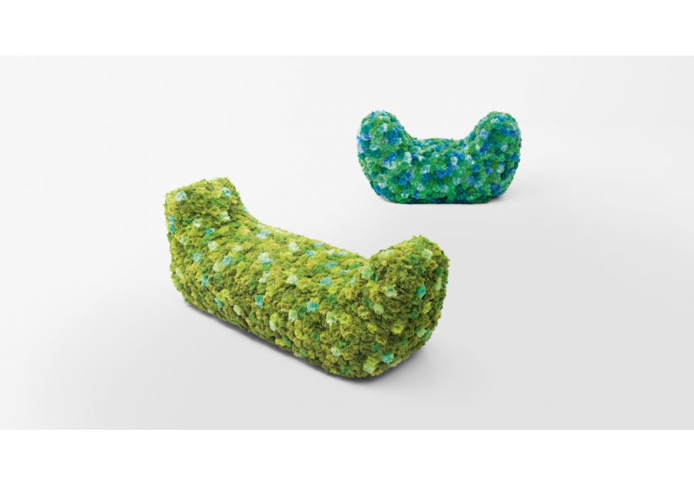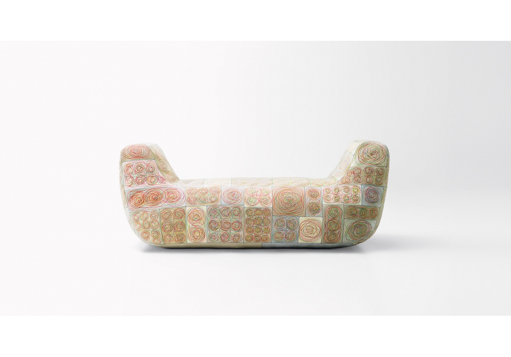Metamorfosi Bruco diseñado por Campana para Paola Lenti es un asiento con respaldos laterales simétricos. El acolchado está contenido en una funda fija de tejido espaciado de poliéster negro y está fabricado con espuma de polietileno reciclable mezclada con fibra de poliéster azul Aerelle®. El revestimiento exterior del asiento es desenfundable y está formado por una capa de fieltro sintético, sobre la que se aplica una decoración, disponible en diferentes colores. Para garantizar una mayor estabilidad, el asiento está lastrado en el interior con sacos de arena. El banco está disponible en dos tamaños.