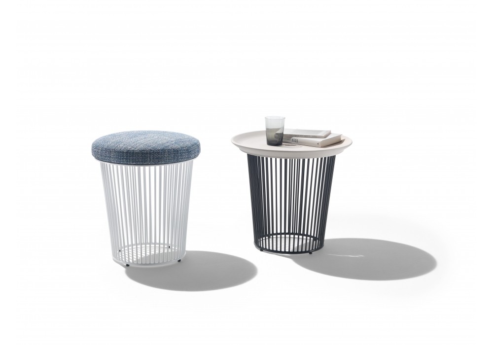 Berry Outdoor diseñado por Design Center para Flexform es un puf de exterior con estructura metálica y tapizado en tejido outdoor.