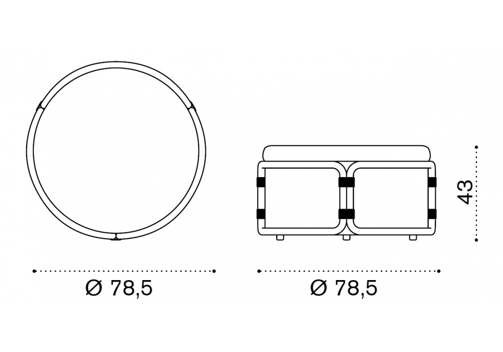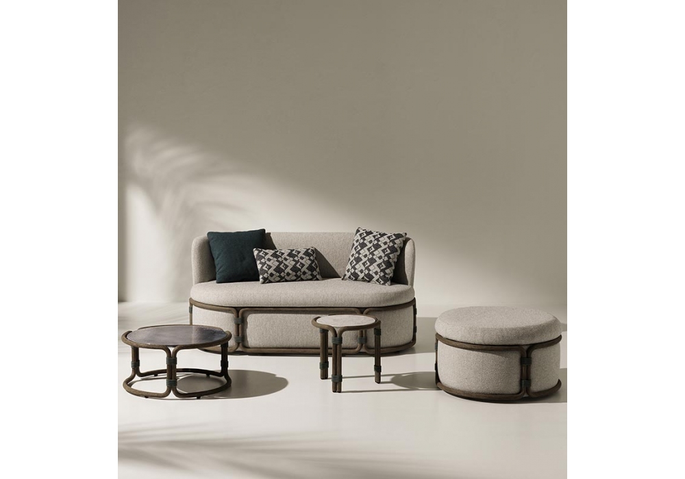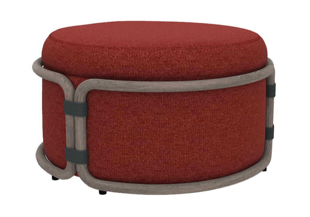 Rotin diseñado por Zanellato/Bortotto para Ethimo es un puf circular con estructura en teca decapada y tapizado en tejido, disponible en diferentes acabados.