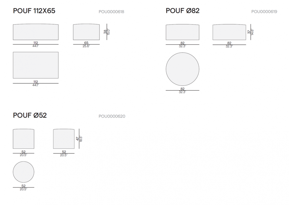 | Dimensiones | - 112 x 65 x H 38 cm; - Ø 82 x H 37 cm; - Ø 52 x H 47 cm. |