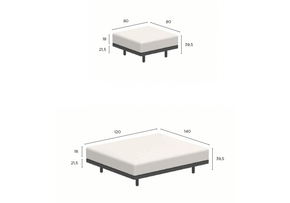 | Dimensiones | - 80 X 80 X H 39.5 cm; - 120 x 140 x H 39.5 cm. |