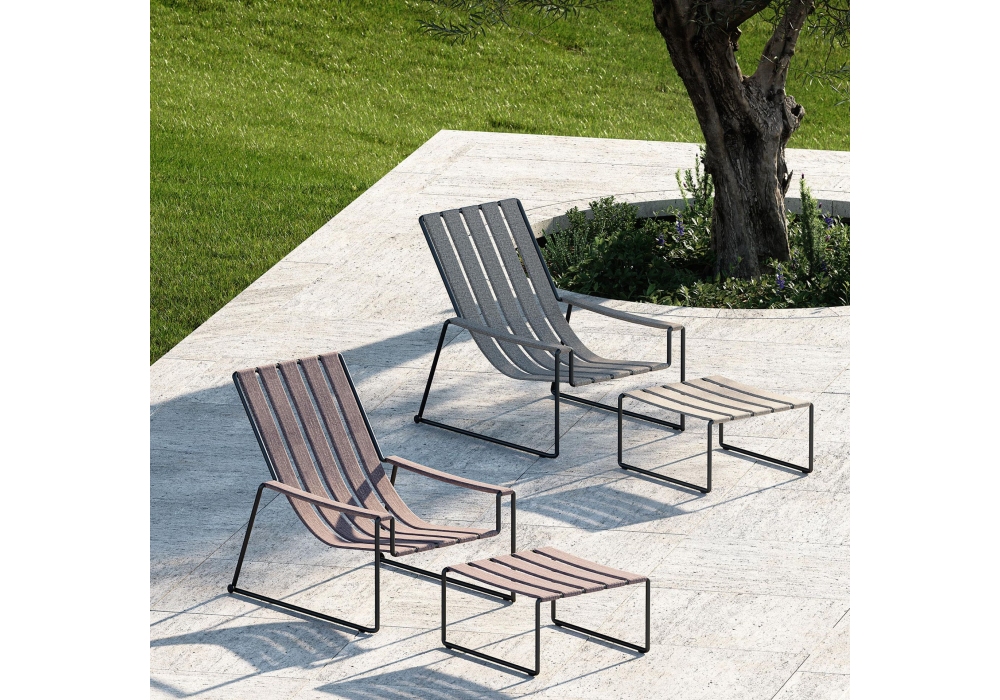 Strappy diseñada por Kris Van Puyvelde para Royal Botania es un reposapiés de exterior con estructura en acero inoxidable pintado y se caracteriza por un tubular continuo que se convierte en una estructura minimalista, funcional y apilable a la que se fijan las correas acolchadas y los reposabrazos. Disponible en diferentes acabados.