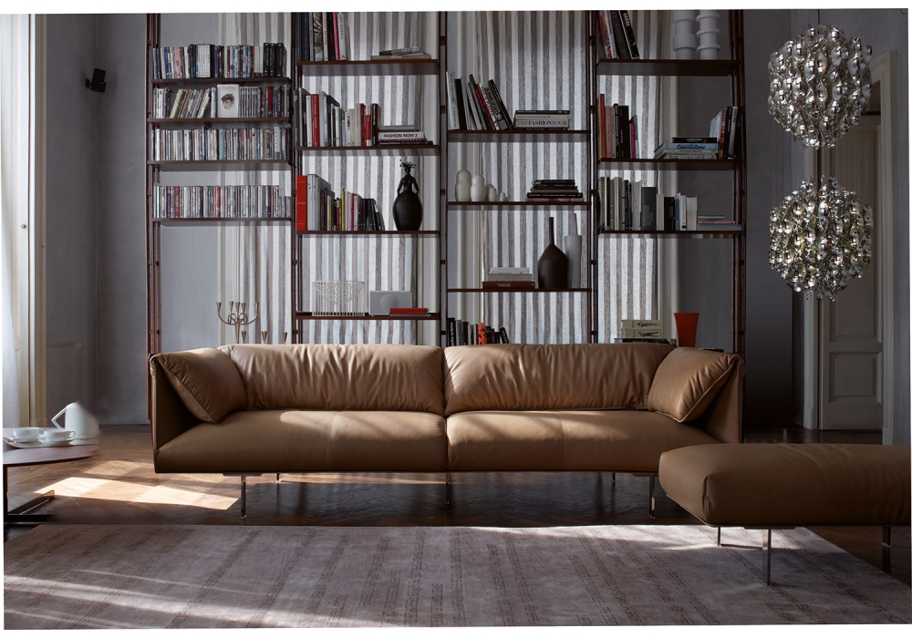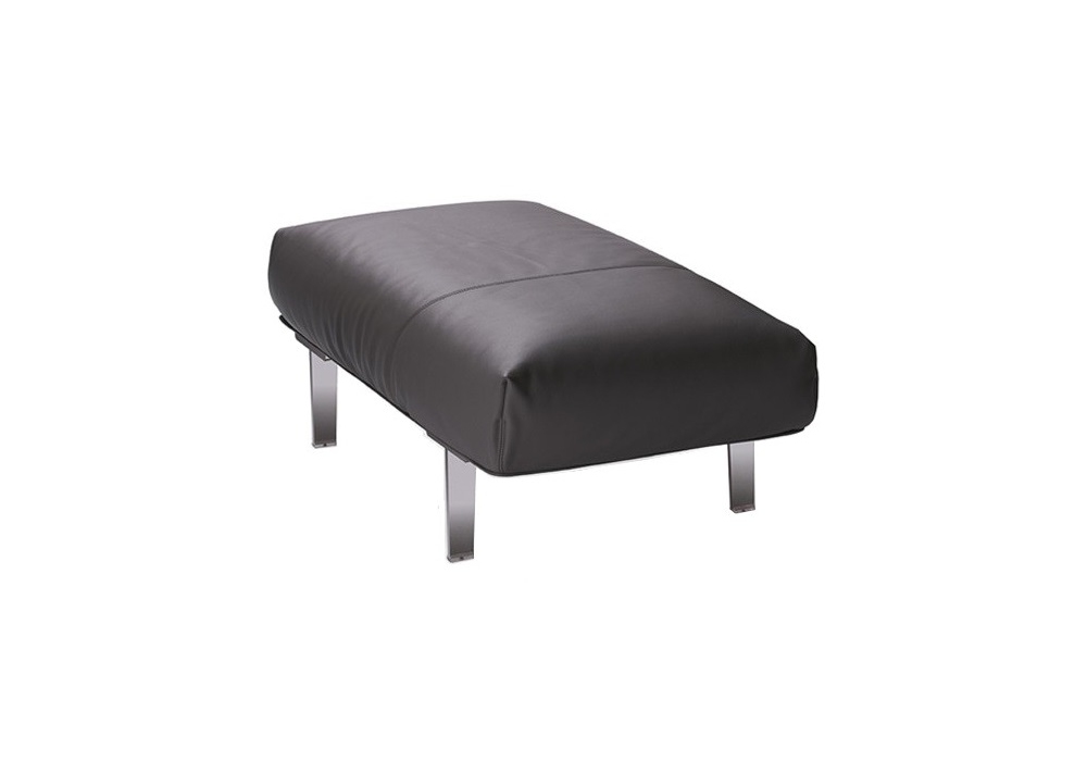 John-John, diseñado por Jean-Marie Massaud para Poltrona Frau, es un reposapiés con estructura de contrachapado de abedul y relleno de espuma de poliuretano y guata de poliéster. Pies de aluminio acabado rutenio con tapones de plástico transparente. Tapizado en piel Frau®, no desenfundable.