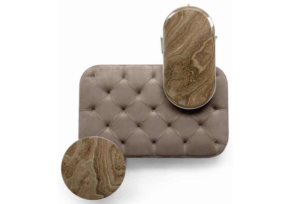 Fritz diseñado por Castello Lagravinese Studio para Opera Contemporary es un puf con un refinado trabajo capitonnè que se presenta en el asiento y revestimiento disponible en tejido o piel. Base metalica, disponible en diferentes acabados.