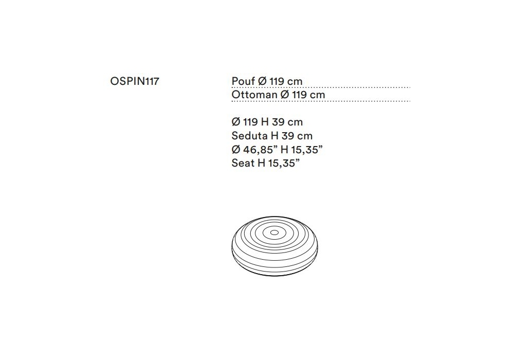 Spin Large diseñado por Claesson Koivisto Rune para Tacchini es un puf con estructura interna en contrachapado de álamo y poliestireno, con relleno de espuma de poliuretano en diferentes densidades. La base está formada por pies de polipropileno negro. La tapicería y las costuras están disponibles en diferentes acabados.