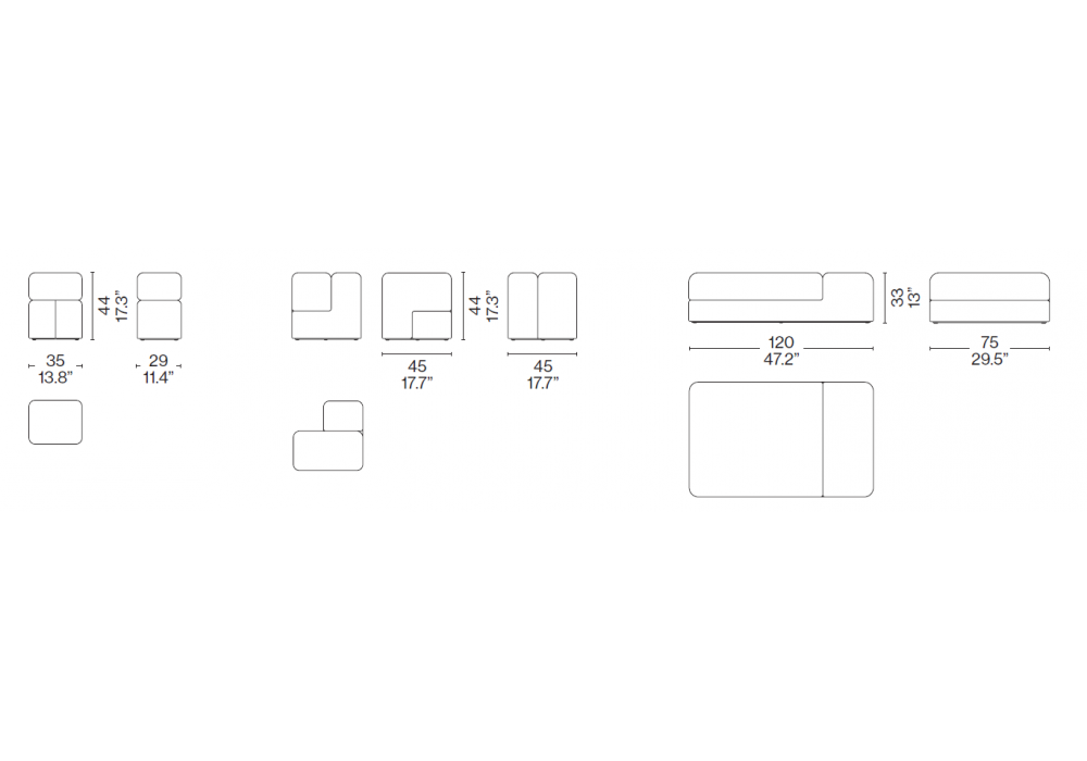 | Dimensiones | 35 x 29 x H 44 cm; 45 x 45 x H 44 cm; 120 x 75 x H 33 cm. |
