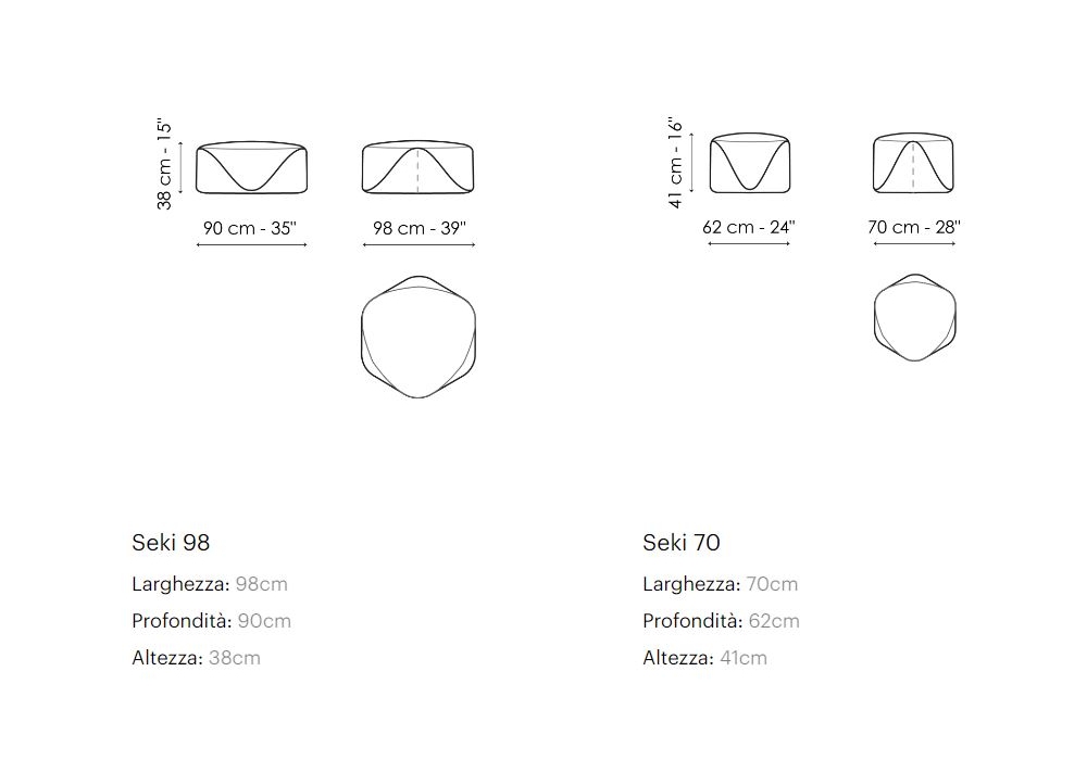 Seki diseñado por Marconato y Zappa para Bonaldo es un puf con revestimiento en tejido fijo e inserción en piel en la parte inferior. Disponible en dos tamaños.