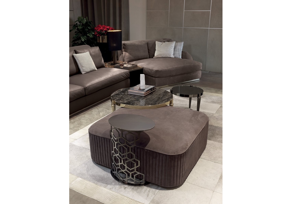 Felix diseñado por Giuseppe Iasparra para Longhi es un puf con estructura de madera recubierta de espuma de poliuretano de densidad media. Revestimiento en piel o tela no desenfundable. Disponible en la versión con lado liso o acolchado vertical