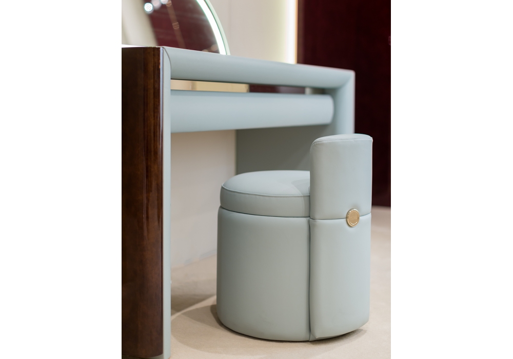 Madison diseñado por Andrea Bonini para Turri es un puff con estructura de metal y madera maciza acolchada con espuma de poliuretano con revestimiento de tejido o piel no desenfundable. Inserciones de metal en acabado dorado claro.