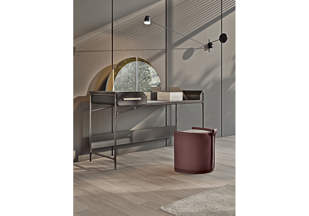 Vine diseñado por Frank Jiang para Turri es un puff con estructura de madera contrachapada y madera maciza acolchada con espuma de poliuretano. Tapizado de estructura y cojines en diferentes pieles o tejidos. Piezas de metal en oro cepillado o bronce.