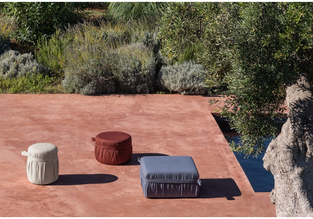 Herm Outdoor diseñado por Gianluigi Landoni para Potocco es un puf de exterior tapizado en espuma de poliuretano ignífuga y revestido en tejido. La banda puede ser a contraste o del mismo color que la tapicería. Disponible en tres dimensiones.