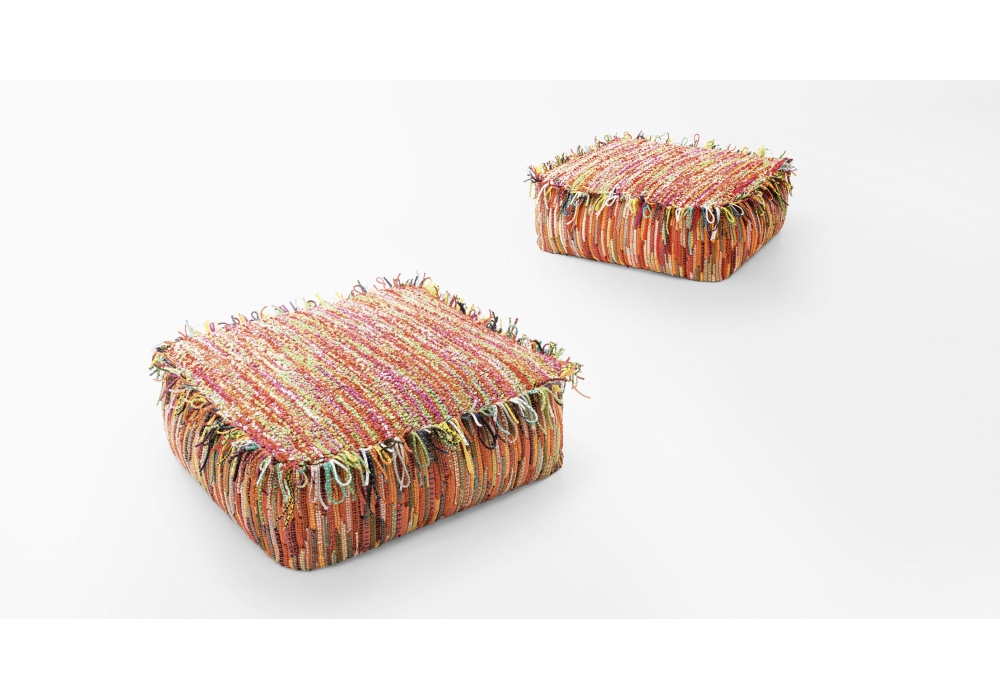 Zebrù diseñado y producido por CRS Paola Lenti es un puf con revestimiento de tela, disponible con o sin flecos. La estructura está acolchada con microesferas de polipropileno, forro fijo en tejido de poliéster espaciado. Revestimiento exterior desenfundable de tejido bouclé tejido a mano. Colección Mottainai 2023.