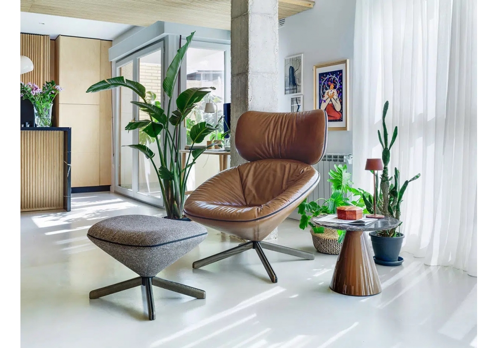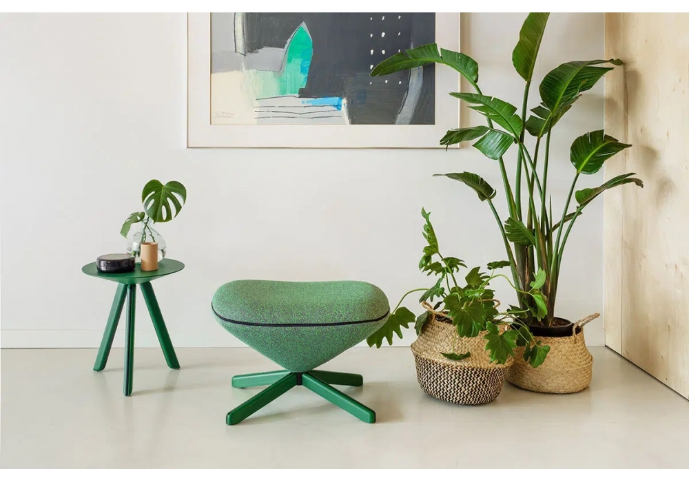 Tortuga diseñado por Isaac Piñeiro para Sancal es un puf con patas en acero y fresno teñido, tapizado en tela o piel. Disponible en diferentes acabados.