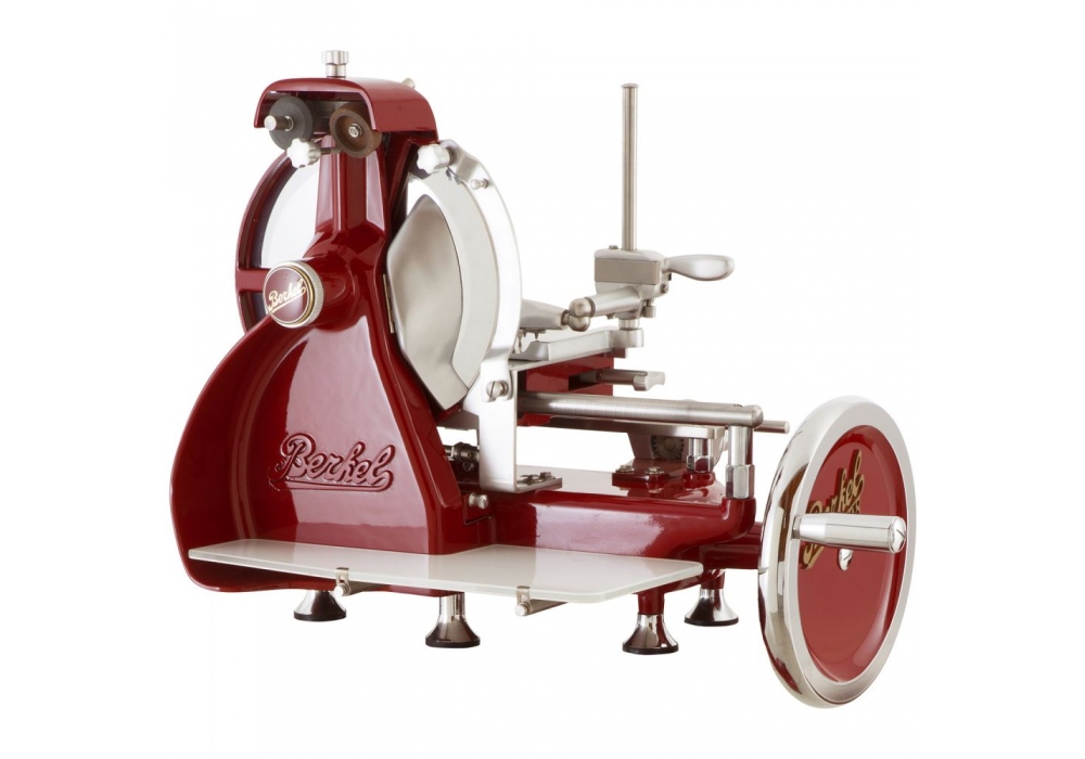 Volano B2 diseñada por Berkel es una rebanadora de acero. También disponible en dos acabados: rojo o negro. A petición, el pedestal está disponible como accesorio.