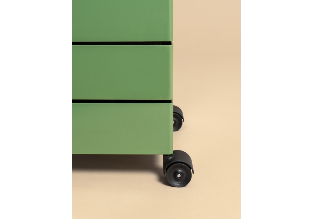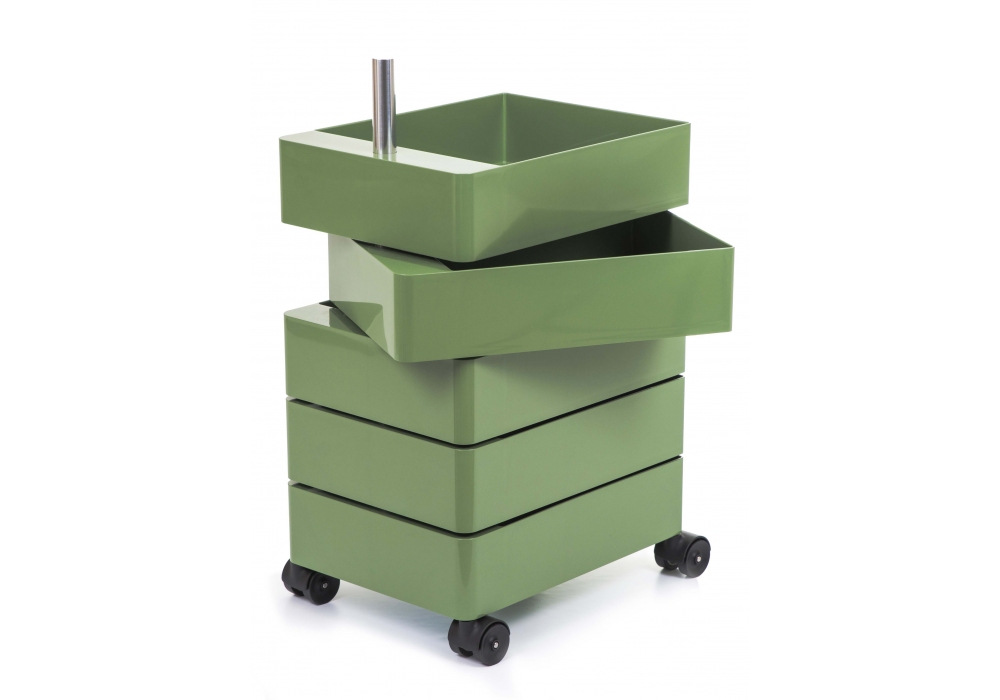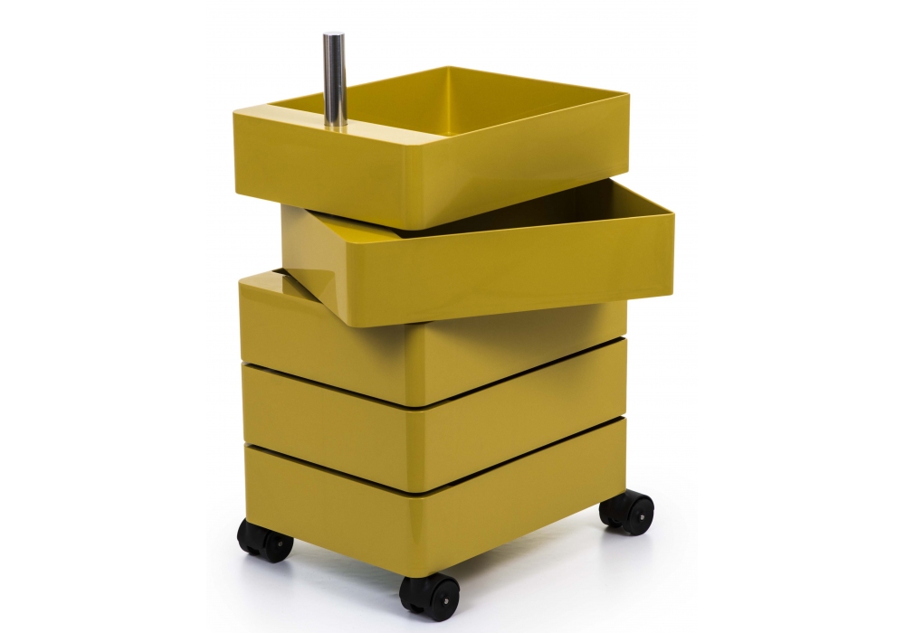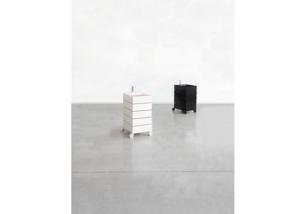 360° Container diseñada por Konstantin Grcic para Magis es una cajonera baja en ABS brillante, completa con bandeja y posibilidad de añadir una bandeja adicional. Tubo de conexión en aluminio pulido. Disponible en diferentes acabados.