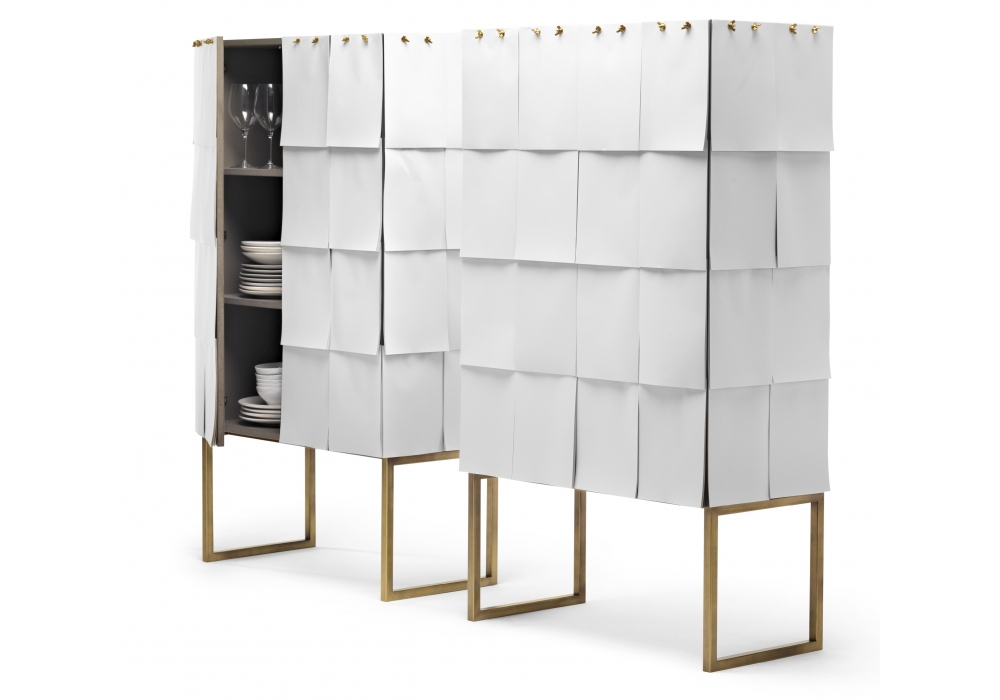 Notes diseñado por Claudio Bitetti para Mogg es un aparador con el frente y los lados cubiertos con hojas blancas en formato A4, superpuestas e intercambiables. Base de metal. Es posible aplicar cualquier hoja / impresión / foto en formato UNI A4.