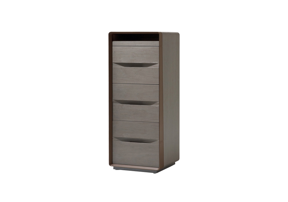 Frame diseñada por Carlo Colombo para Giorgetti es una cajonera con el marco en arce disponible en dos acabados: gris paloma y gris pizarra. El perfil lateral está cubierto con cuero. Dispone de seis cajones completamente desmontables con piezas internas en sicomoro Fiddleback pintado en arena, con asas empotrables y correderas deslizantes, y un estante deslizante en cuero en la parte superior. Los pies se pueden ajustar para nivelar.