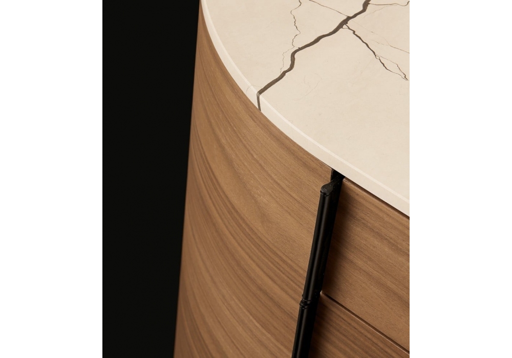 Onda diseñada por R&D Poliform es una cajonera de madera. Cajones con tiradores en cuero y primer cajón con fondo tapizado en cuero y equipado con rejillas divisorias.