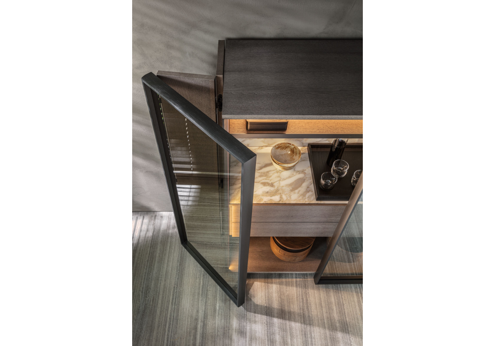 Horizons diseñado por Dante Bonuccelli para Molteni&C es un mueble contenedor realizado con base en metal pintado peltre, estructura en madera. Respaldo adicional y tapa en mármol. Disponible con o sin travesaños revestidos.