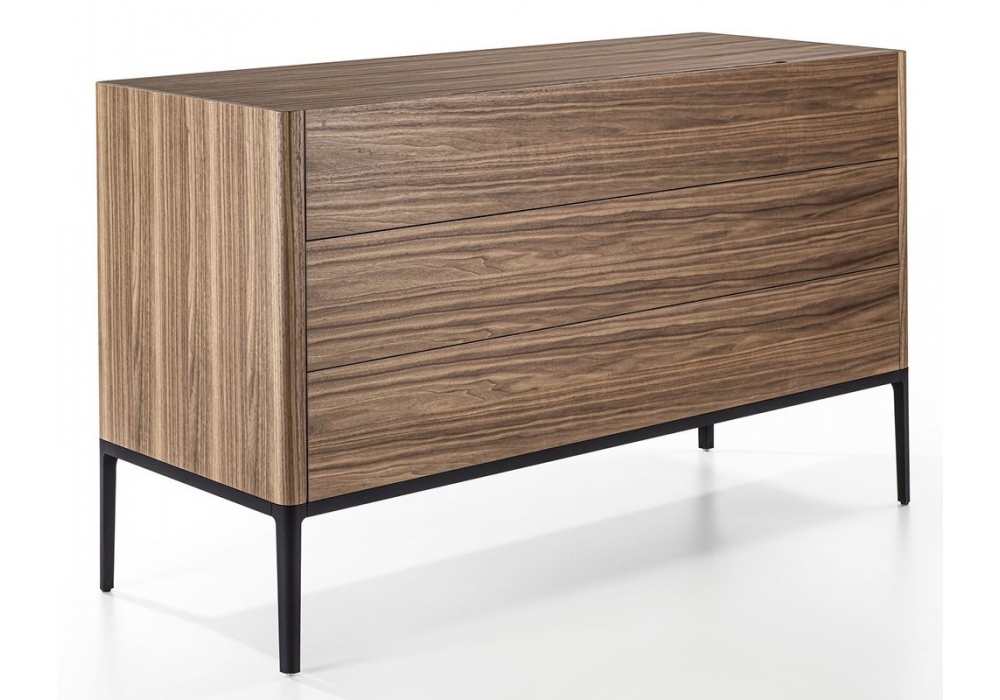 Nara 3 diseñada por D. Dolcini para Porada es una cajonera en nogal canaletta y base en metal negro mate realizada con aluminio inyectado.