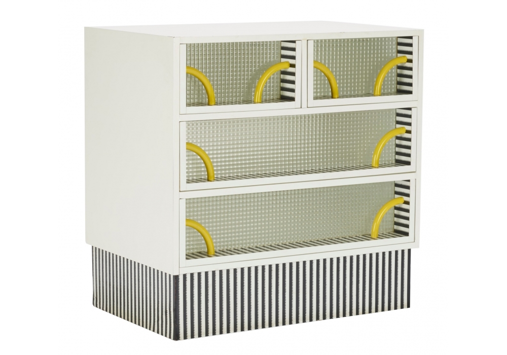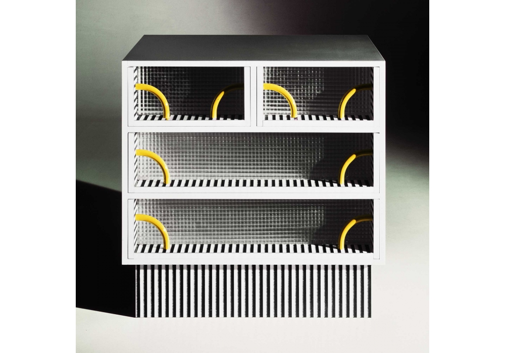 Atlantic diseñada por Michele De Lucchi para Memphis Milano es una cajonera realizada en laminado plástico, metal y vidrio.