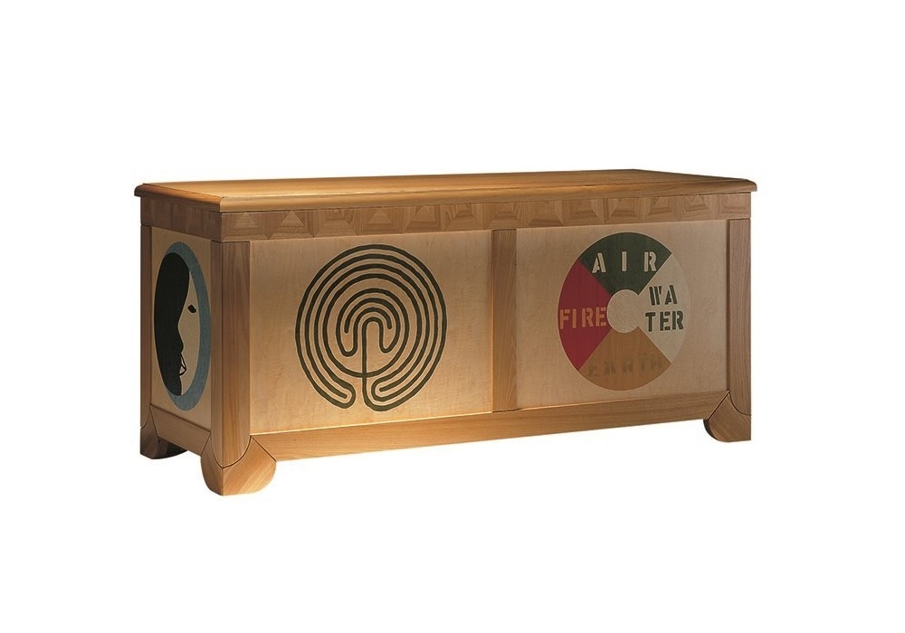 7780 Alchera diseñado por Joe Tilson para Zanotta Edizioni es un cofre con estructura en madera de olmo y paneles de arce con incrustaciones policromadas. Interior con cajón abatible.