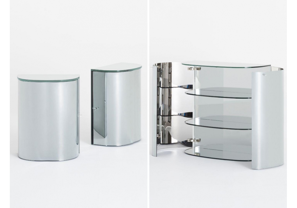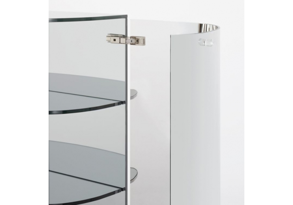 Oltralpe diseñado por Inga Sempè para Glas Italia es un mueble contenedor con estructura de vidrio laminado de 6 + 6 mm totalmente espejado, tanto por dentro como por fuera. Las puertas son de cristal espejado de doble cara curvado y templado de 6 mm, con reflejos distorsionados e indefinidos, que hacen que el material sea escurridizo y de aspecto casi líquido. Las puertas tienen un cierre blumotion amortiguado y pueden abrirse mediante tiradores cilíndricos de cristal.
