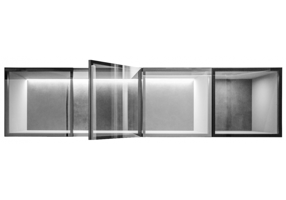 Vtheca diseñado por Viva es un sistema de nichos realizados sobre un marco de aluminio retráctil. Puerta de cristal. Disponible en diferentes acabados, versiones y configuraciones.