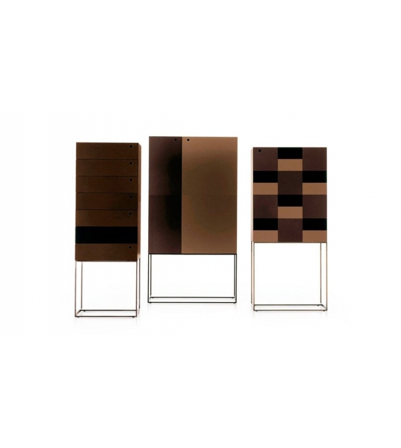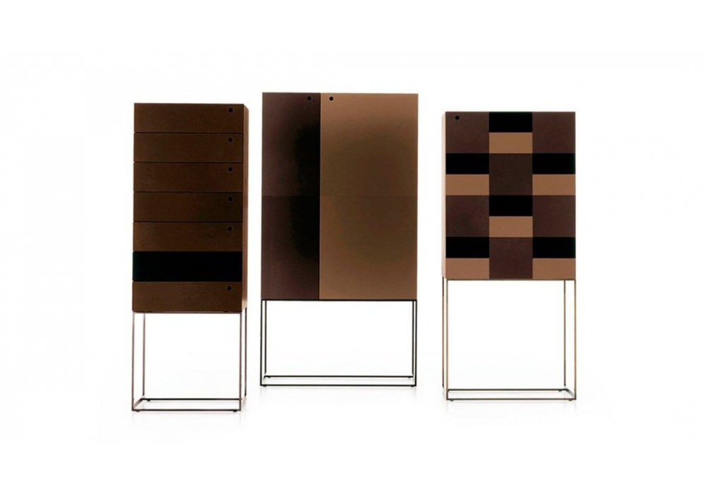 Arabesque diseñado y producido por Ivano Redaelli es una cajonera cuadrangular estructurado en madera revestida en piel plena flor o lacada en barnices mates o brillantes. La base es de metal color bronce o níquel.