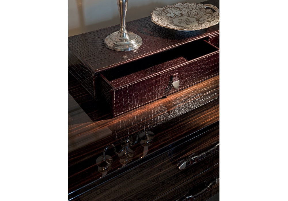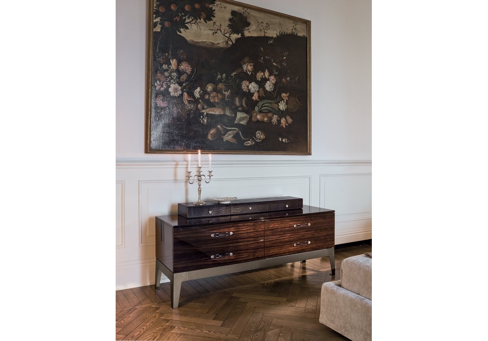 Monsieur diseñada por Giuseppe Viganò para Longhi es una cajonera con 4 cajones, estructura en madera contrachapada o lacada brillante y base en metal pulido cortado con láser en acabado brillante o mate. El elemento superior con tres cajones está completamente cubierto de cuero. El cajón central está equipado con una cerradura.