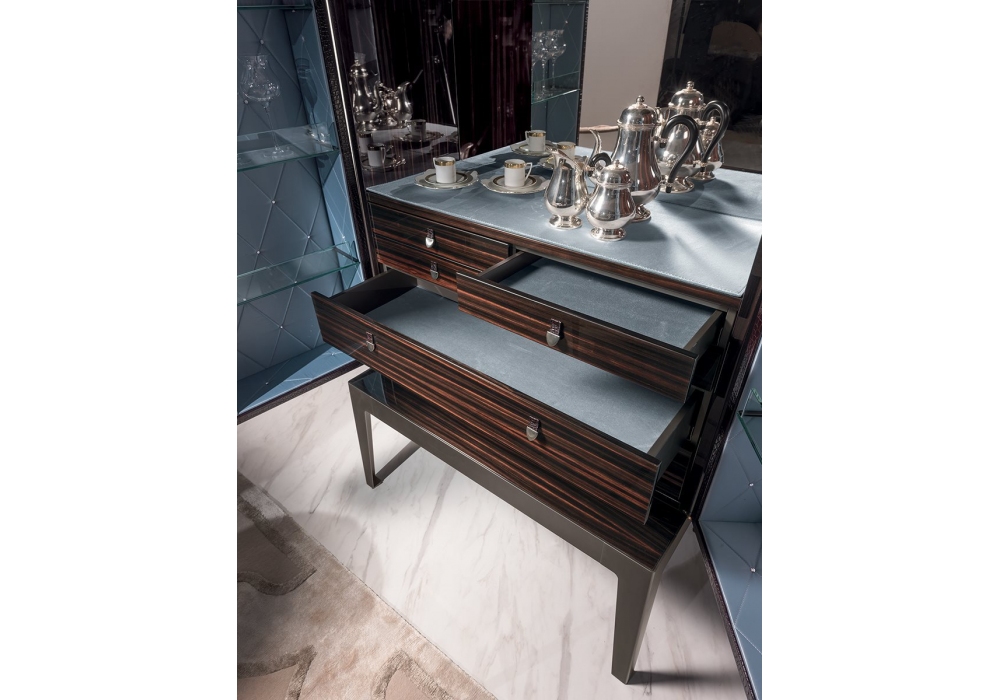 Grandeur Evo diseñado por Giuseppe Viganò para longhi es un mueble alto con puertas revestidas en cuero, base en metal rectificado y estructura en madera chapada o lacada brillante. Interior forrado en terciopelo satinado o acolchado de rombos con botones de Swarovski. Estantes de cristal transparente y tiradores de piel. Mueble central con cajonera de 6 cajones con fondo de terciopelo. Compartimento abierto con fondo de espejo iluminado con luz LED.