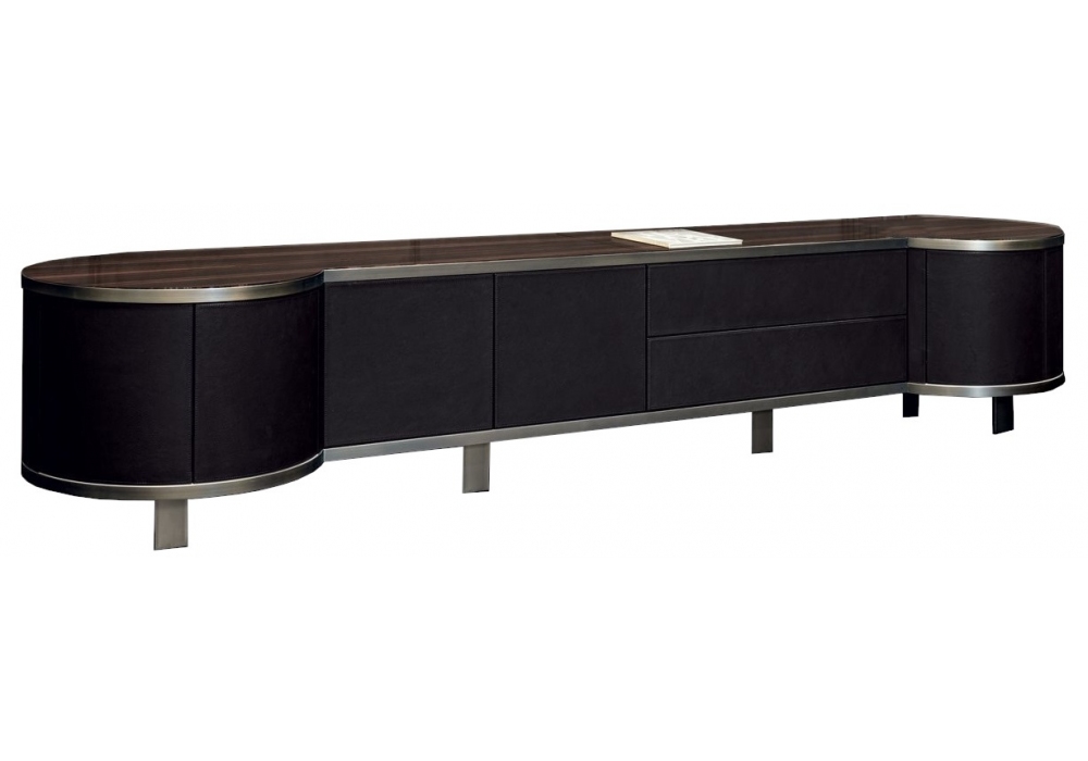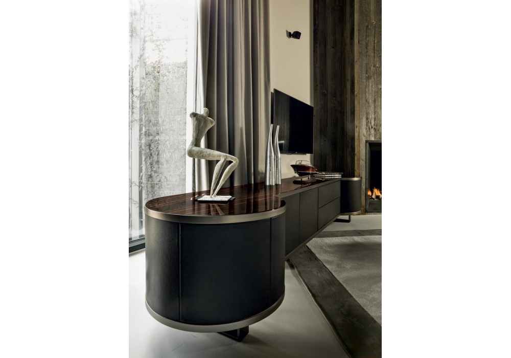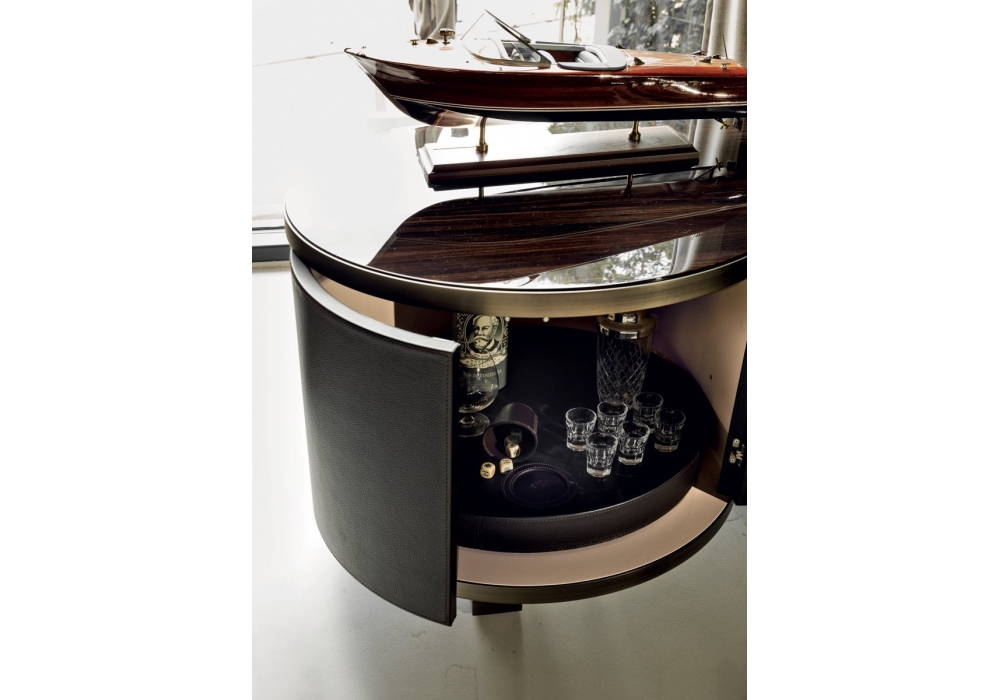 Courbet diseñado por Giuseppe Viganò para Longhi es un mueble contenedor con base en metal pintado bronce, estructura revestida en piel y partes metálicas (borde superior e inferior) en metal rectificado. Tapa en mármol o madera contrachapada. Aberturas push-pull e interior pintado bronce. El interior del terminal redondo y de la isla está lacado brillante rosa empolvado y dispone de una bandeja giratoria revestida en piel y un punto de luz LED automático. Bajo pedido, los módulos centrales se pueden realizar en esencia de madera.