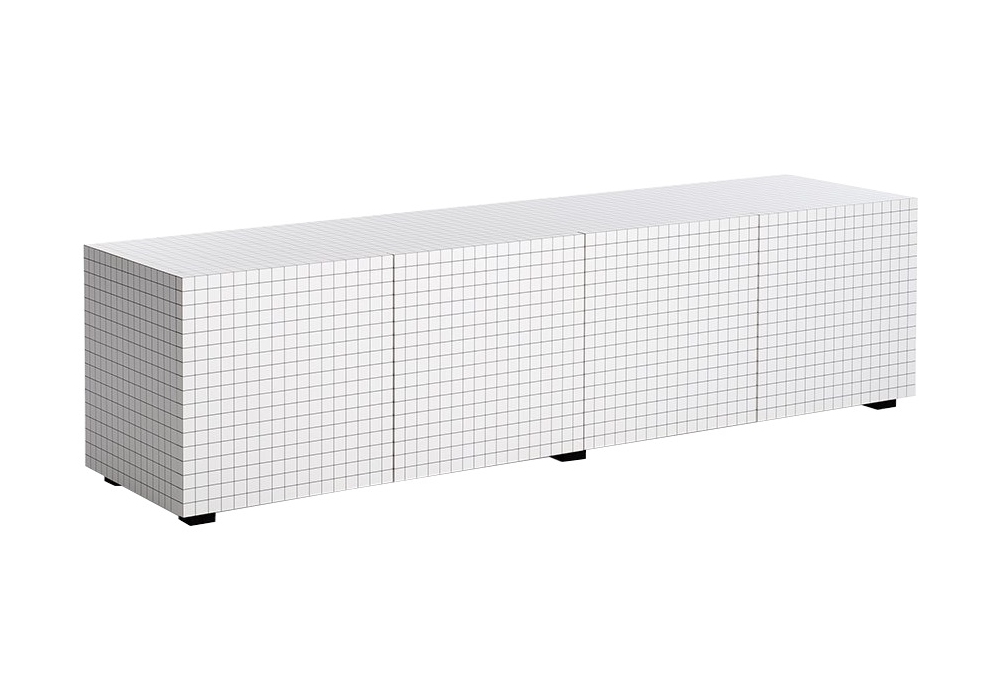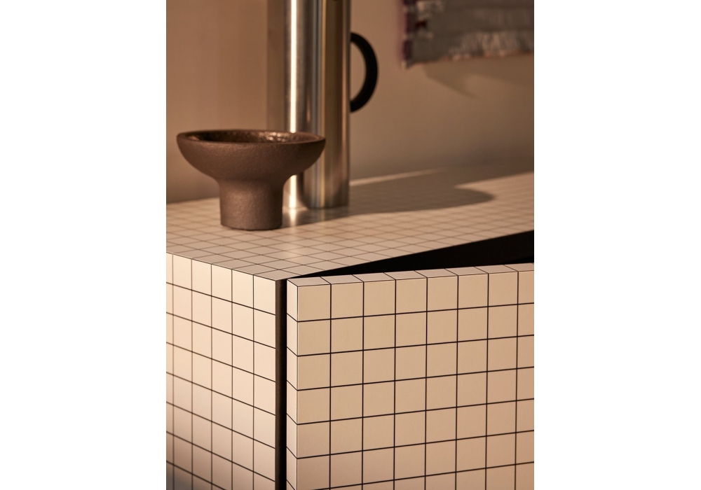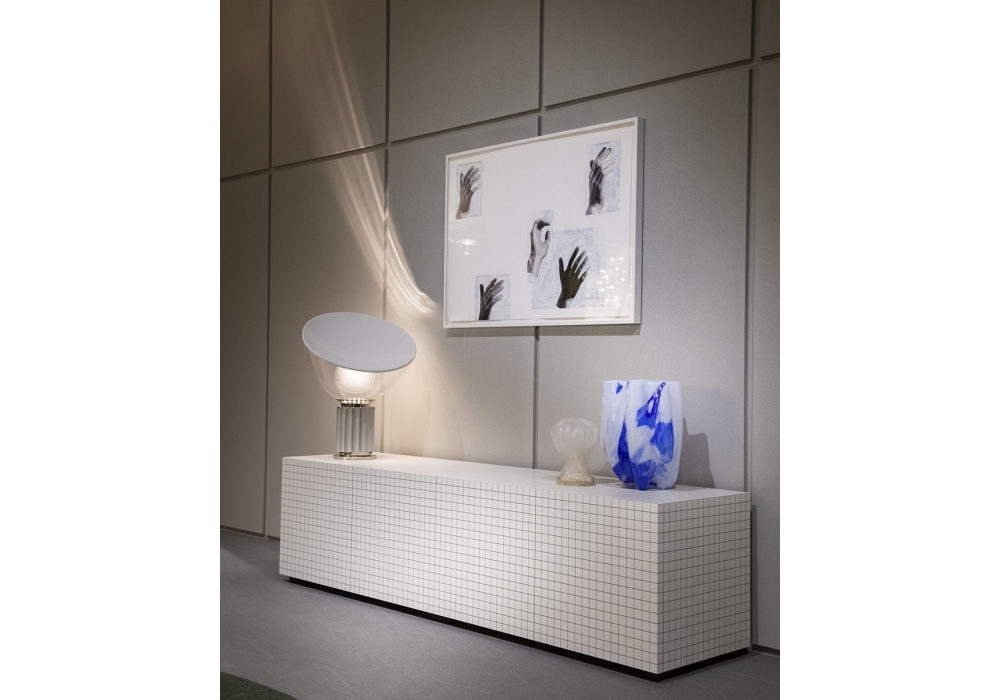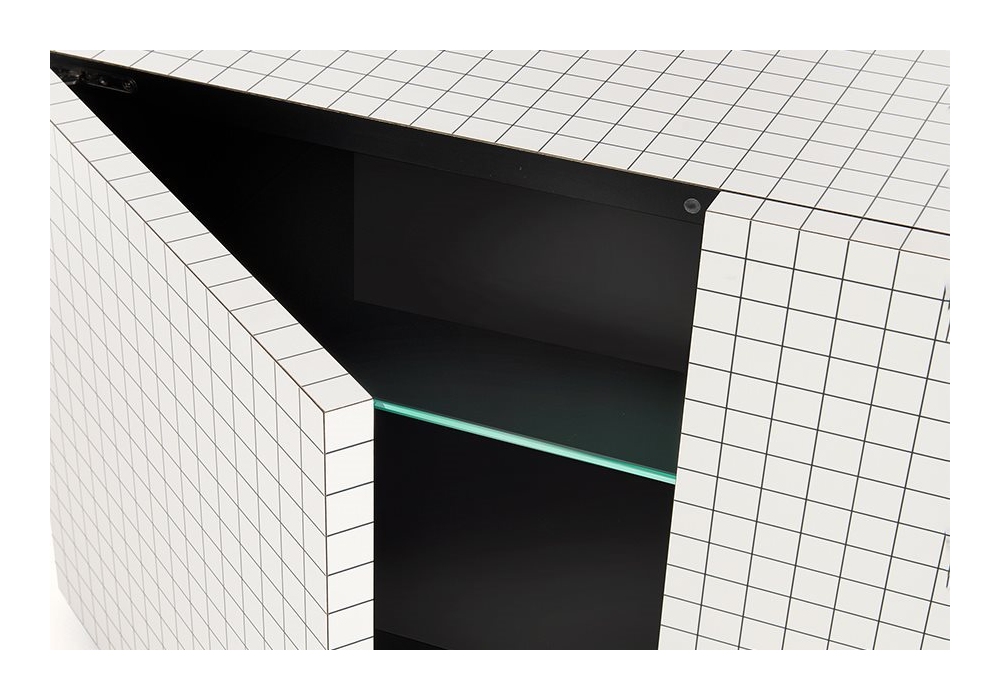 756 Quaderna diseñado por Superstudio para Zanotta es un mueble contenedor con estructura de madera recubierta con laminado Print, color blanco, con impresión digital cuadriculada en negro. Revestimiento interno en laminado negro y estantes internos ajustables en vidrio templado. En la parte posterior, el contenedor está equipado con aberturas para cables.
