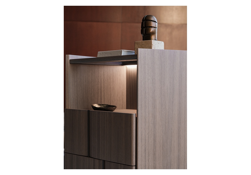 Delphi diseñada por Carlo Colombo para Giorgetti es una cómoda alta realizada en nogal canaletto, disponible en diferentes acabados. Bajo pedido el frontal se puede revestir de piel en los diferentes colores disponibles.