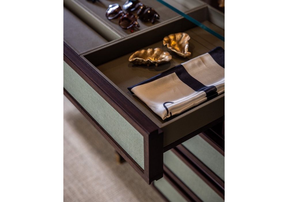 Full Island diseñada por Roberto Lazzeroni para Ceccotti Collezoni es una cajonera independiente con estructura de nogal macizo y paneles frontales y laterales revestidos en tela, cuero o lacados en varios acabados. Superficie superior de vidrio templado extraclaro. Full Island cuenta con varios cajones y bandejas extraíbles.