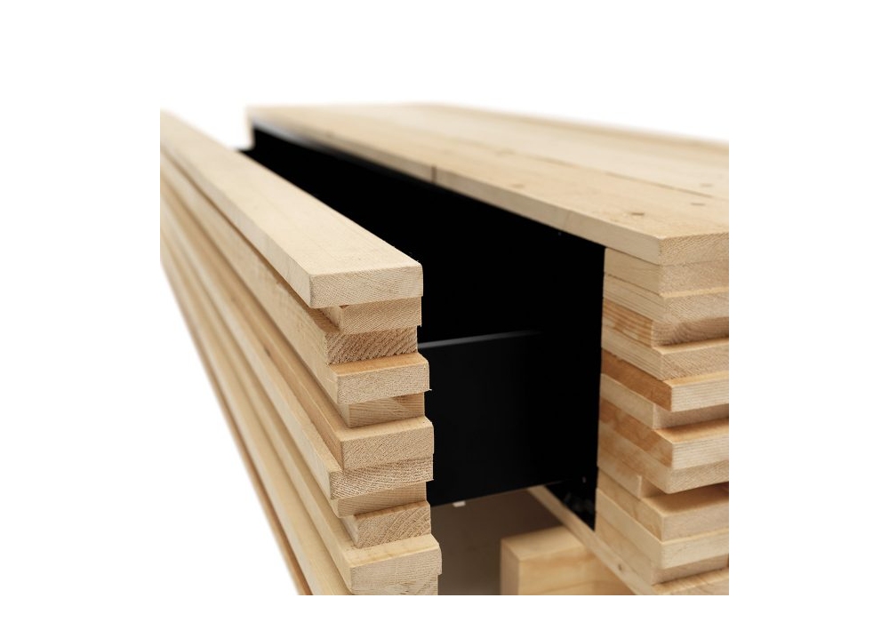 Ordinaryday Low diseñado por Raphael Charles para Mogg es un contenedor de 2 cajones con un solo frente en madera maciza de abeto con acabado natural. Estructura, cajones internos y respaldo en color negro. Respaldo decorativo opcional.
