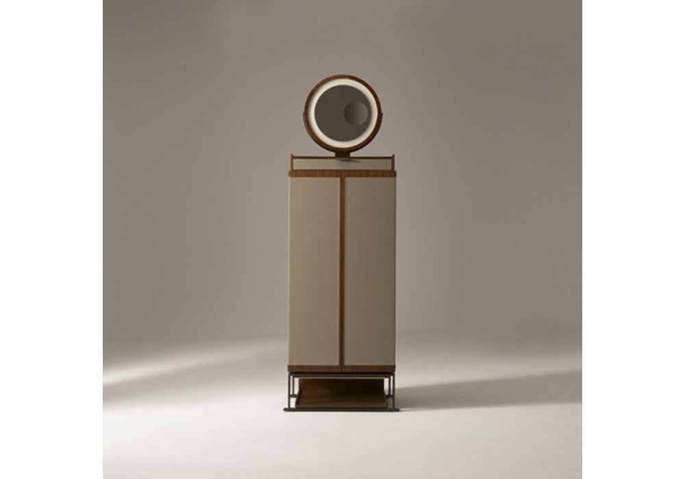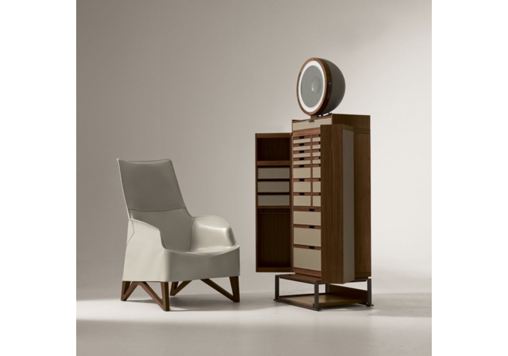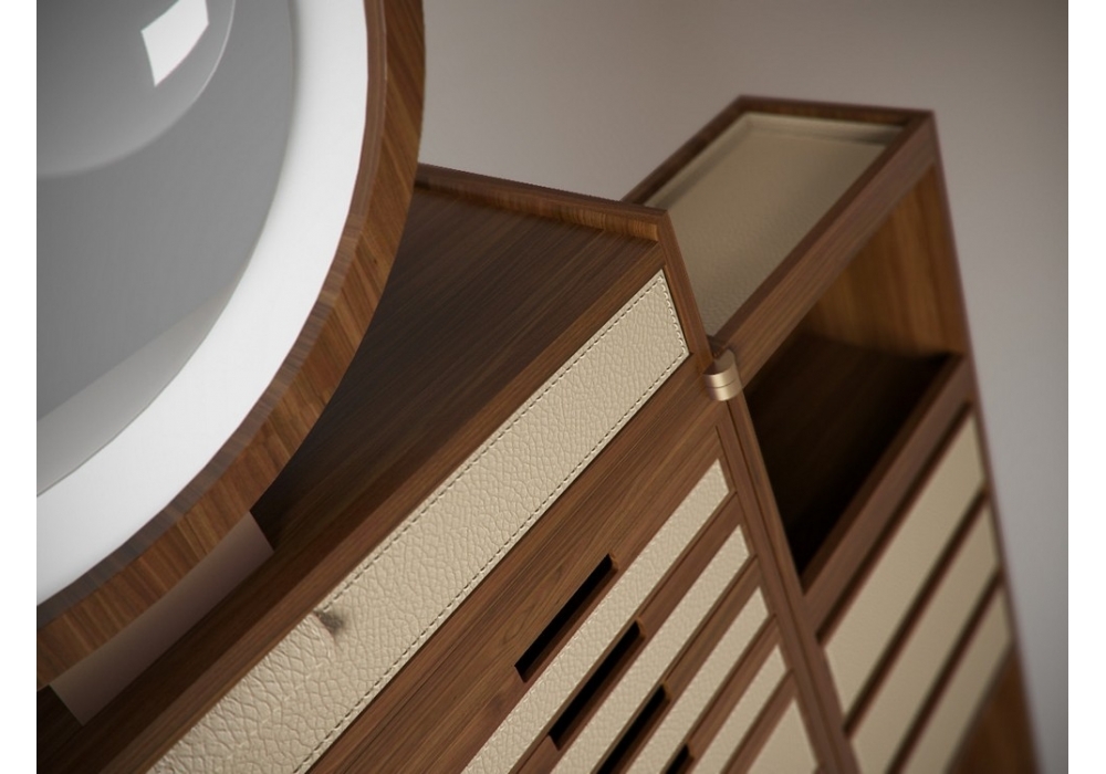 Oro diseñada por Chi Wing Lo para Giorgetti es una cómoda alta en nogal canaletto e inserciones de cuero, con cajones de tres tamaños diferentes y dos puertas contenedor con cajones internos y secretaria. Oro está disponible en la versión sin o con espejo circular, con lupa y ángulo ajustable. Las partes metálicas y la base son de metal pintado bronce.