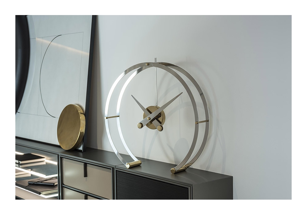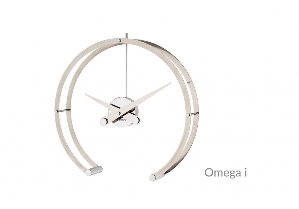 Omega diseñado y producido por Nomon es un reloj de sobremesa con aros y agujas en acero inoxidable, con o sin detalles en oro, caja central en latón pulido.