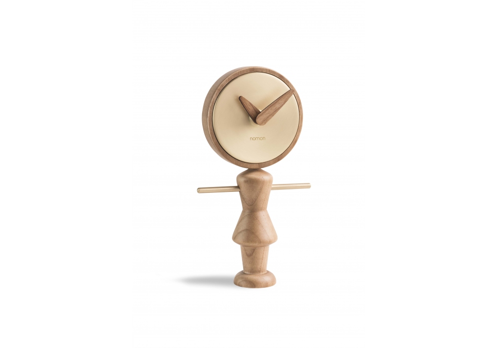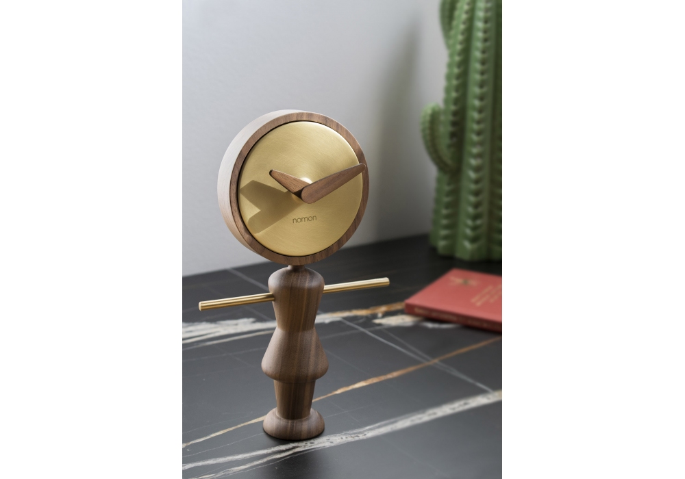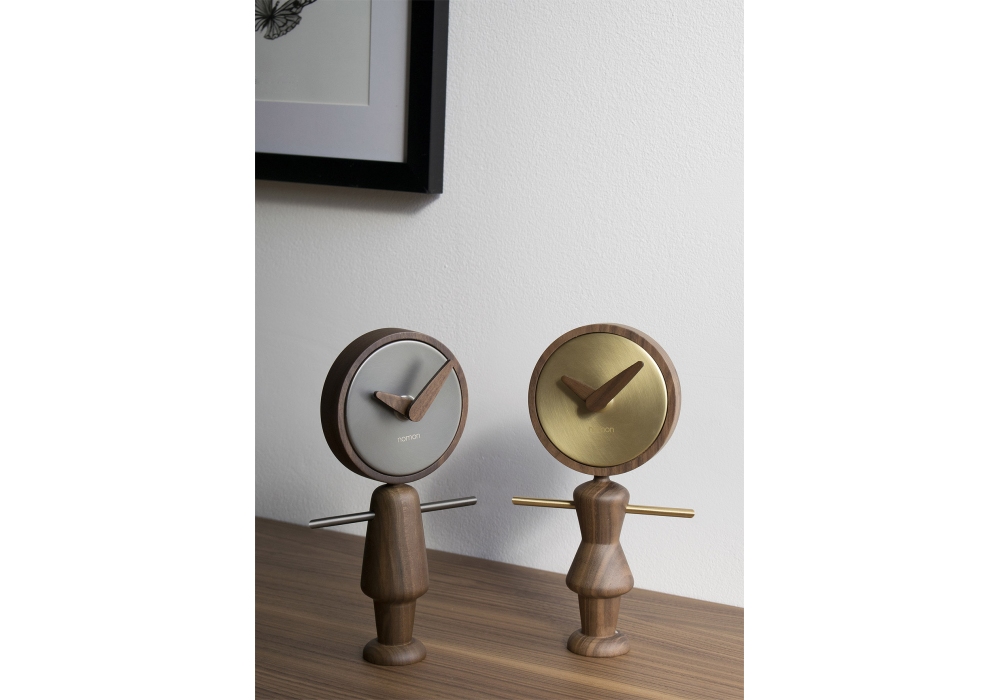 Nena diseñado y producido por Nomon es un reloj de sobremesa con caja en latón pulido o acabado grafito, cuerpo y agujas en nogal o roble.