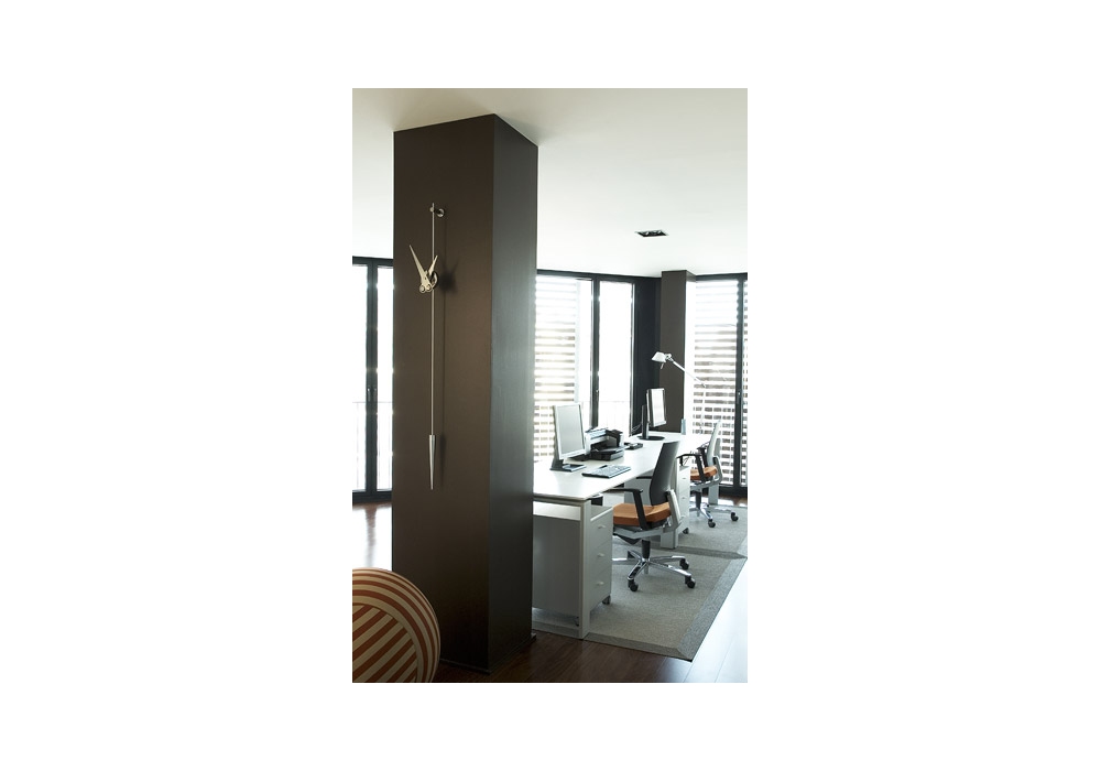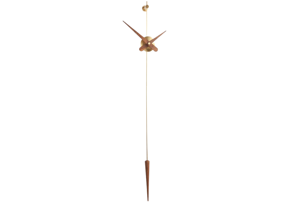 Punto y Coma diseñado y producido por Nomon es un reloj con agujas y péndulo en acero o madera de nogal, caja central en acabado cromado, latón pulido o grafito.
