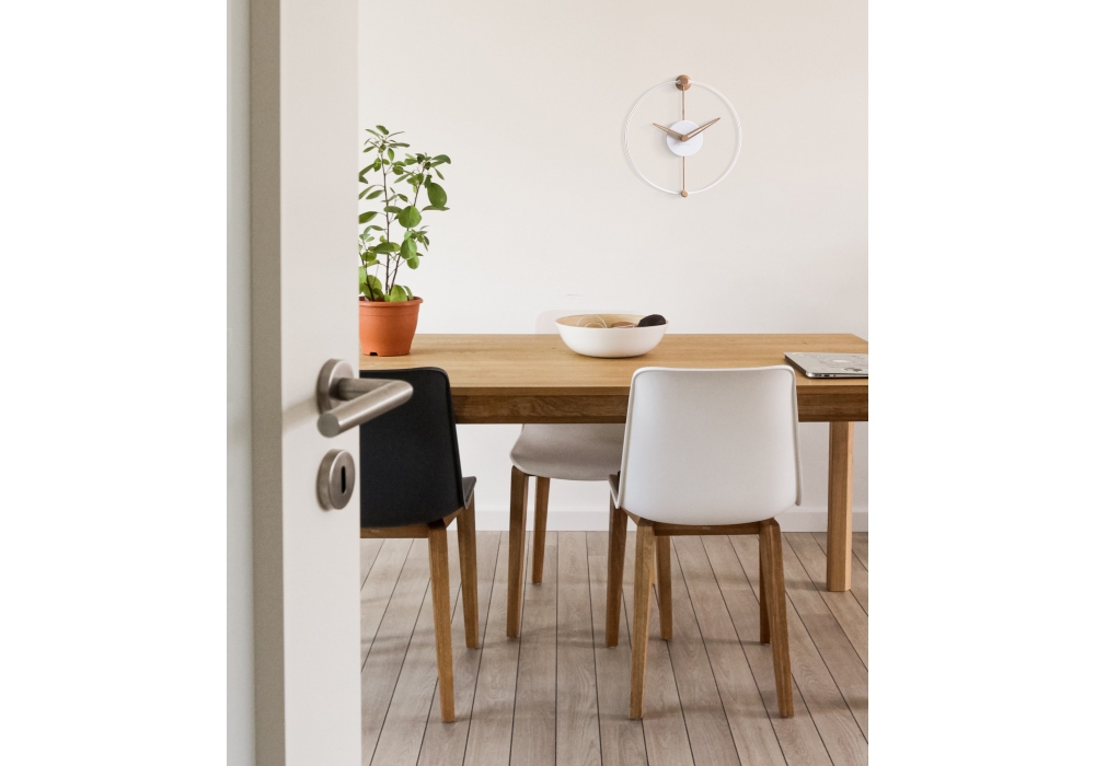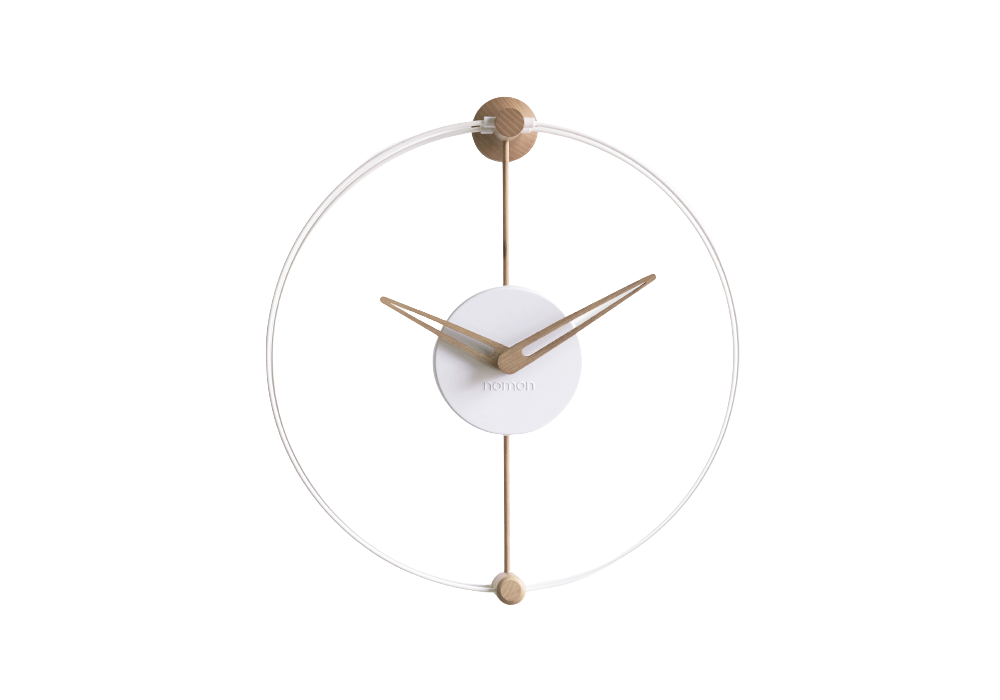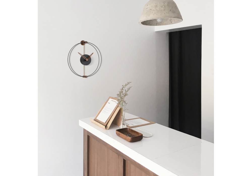 Nano diseñado y producido por Nomon es un reloj de pared con agujas y detalles en madera de nogal o roble, la caja central es de poliestireno negro.