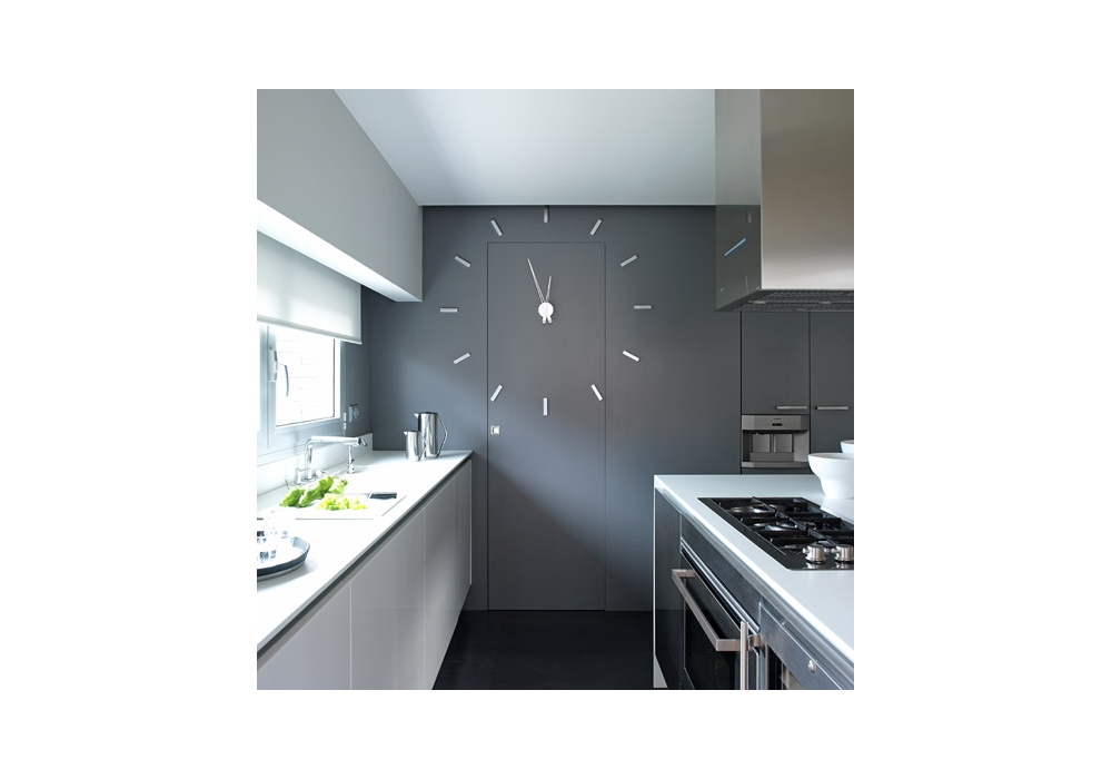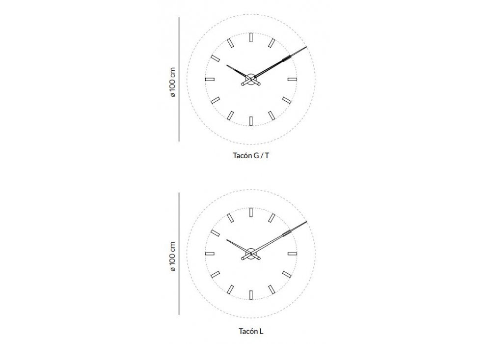 Tacòn G/T/L diseñado y producido por Nomon es un reloj de pared con 4 o 12 señales horarias en latón cromado o pulido, agujas en nogal barnizado en diferentes acabados.