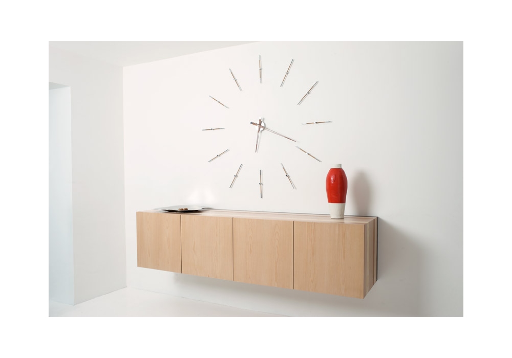 Merlìn I diseñado y producido por Nomon es un reloj de pared con 4 o 12 señales horarias en latón cromado y agujas en acero inoxidable pintado en diferentes acabados.
