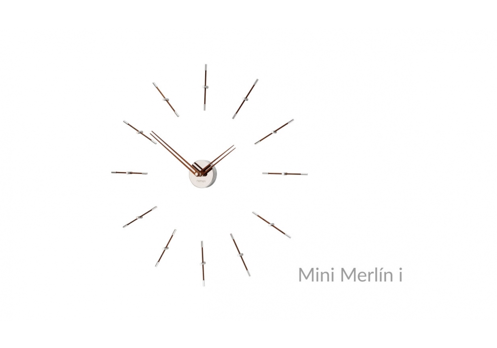 Mini Merlìn diseñado y producido por Nomon es un reloj de pared con 4 o 12 señales horarias en latón cromado o pulido, agujas en madera de nogal.