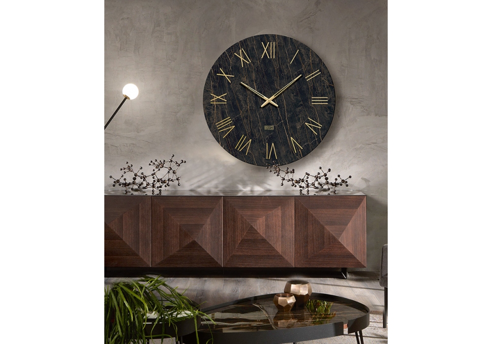 Portofino diseñado por Riflessi es un reloj de pared realizado en vidrio serigrafiado con efecto mármol. Disponible en diferentes acabados.