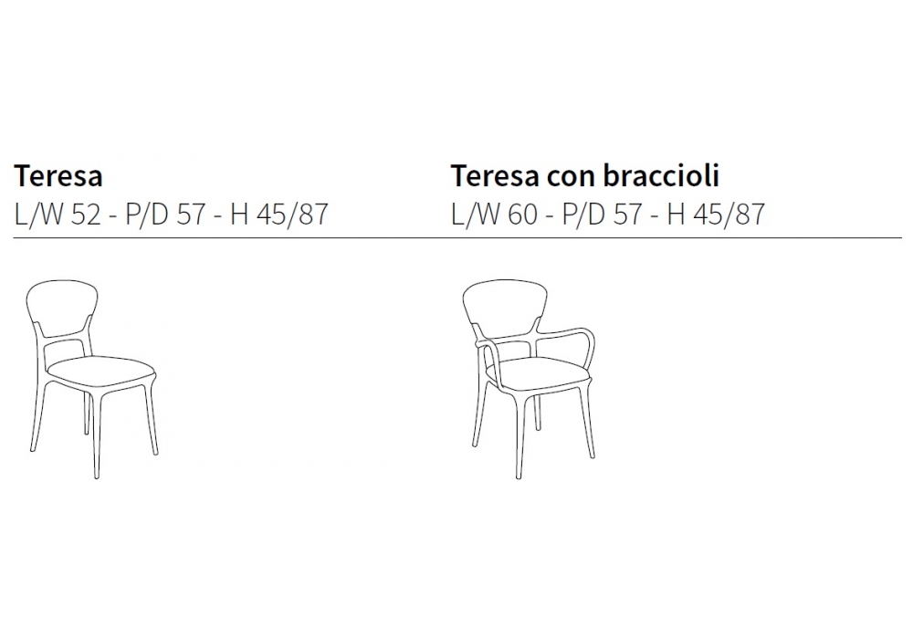 Teresa diseñada por Roberto Lazzeroni para Ceccotti Collezioni es una silla realizada en madera de nogal americano sólido o fresno, asiento y respaldo de madera contrachapada tapizada cubierta de tejido o piel. También disponible en 2 versiones: con o sin apoyabrazos.