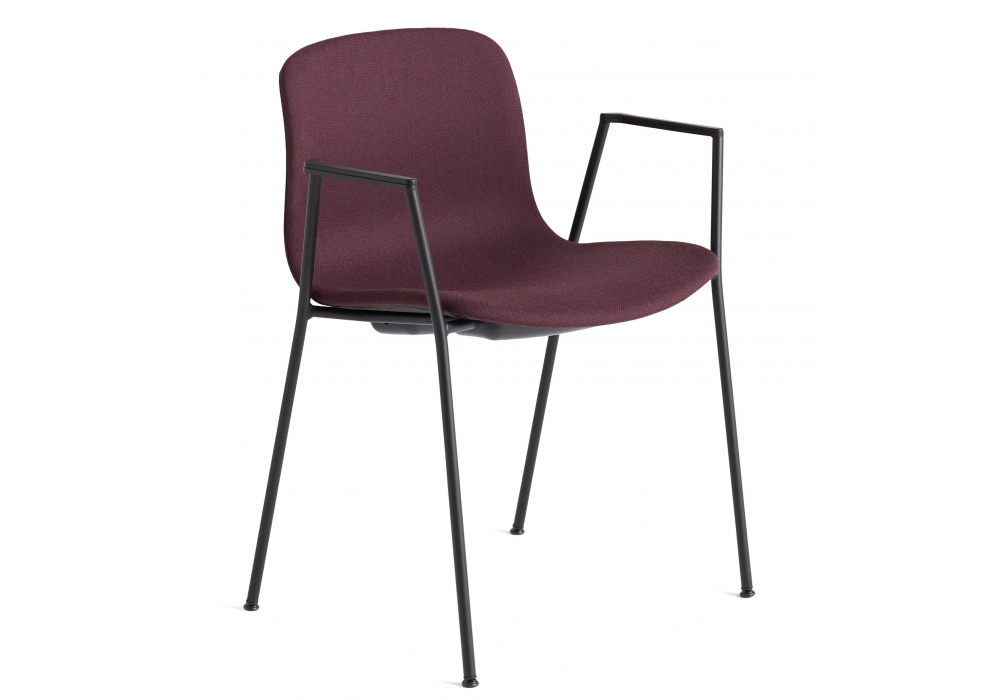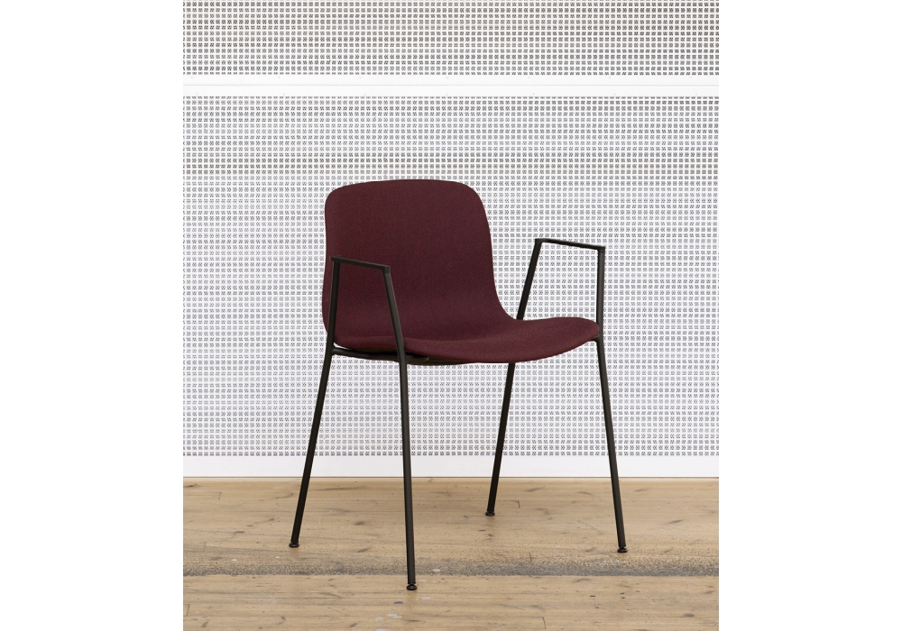 About a Chair AAC 19 diseñada por Hee Welling & Hay para Hay es una silla con carcasa de polipropileno moldeado por inyección con tapizado completo en piel o tela y patas en tubo de acero doblado con reposabrazos integrados en espuma PU negra. Es posible apilar hasta 5 sillas. Disponible en diferentes tapizados.