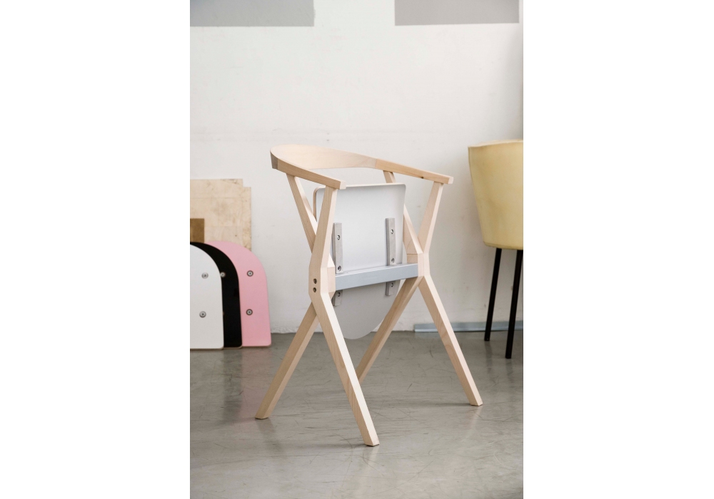 La silla B diseñada por Konstantin Grcic para BD Barcelona es una silla realizada en madera contrachapada de haya. La parte inferior está enchapada en madera de fresno y la trasera en madera maciza de fresno. La estructura inferior es de tubo de acero y piezas de fundición de aluminio pintadas en polvo de color blanco o negro. También está disponible una versión con asiento tapizado en piel o tela. Disponible en diferentes acabados.
