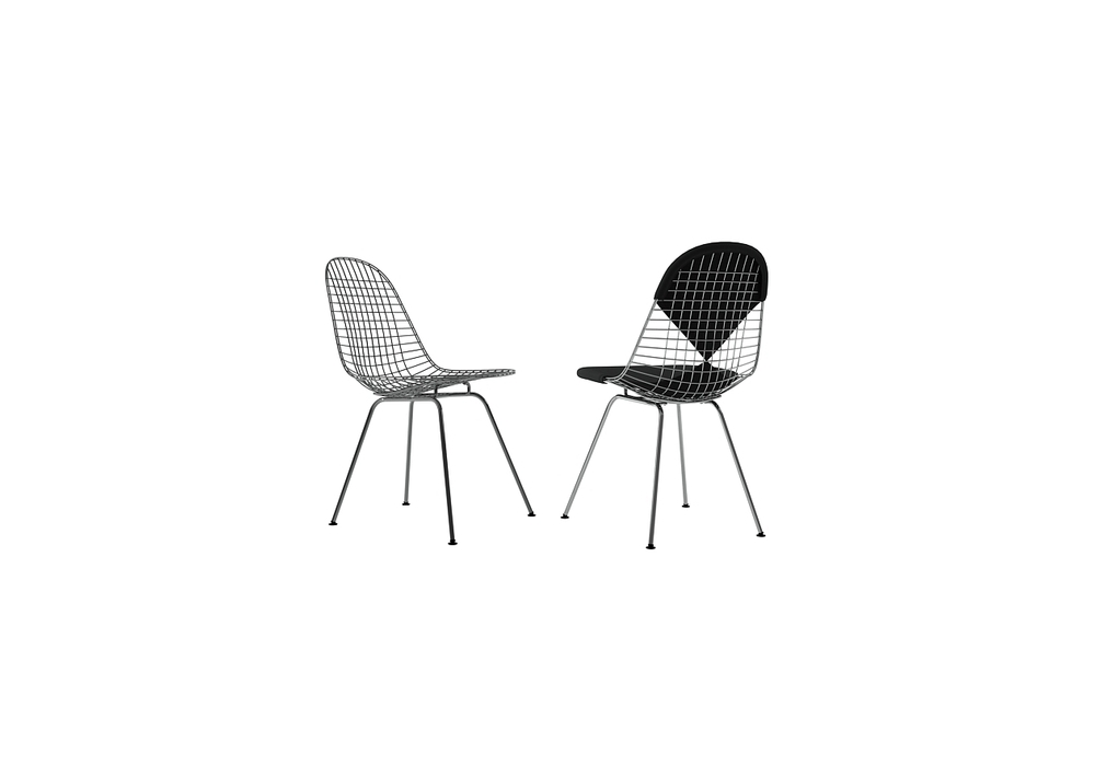 Vitra Wire Chair silla: Con la Wire Chair, los Eames varían el tema de la carcasa de asiento orgánica de una sola pieza, dándole una ligera transparencia y un alto grado de tecnicidad. Las sillas están disponibles sin tapizar, con cojines de asiento o con acolchados para el asiento y el respaldo. En esta última versión, las sillas también se denominan "Bikini" debido a su forma.